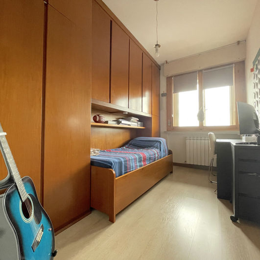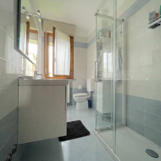 Varcando la soglia, vieni accolto da un ampio soggiorno baciato dal sole occidentale, arricchito da una terrazza che si affaccia sul giardino comunale. La cucina è separata dal tinello da una porta scorrevole in vetro e risulta il cuore pulsante della casa dove trascorrere momenti conviviali in famiglia. Il dolce dormire è garantito dalla zona notte: dal disimpegno entriamo nella camera singola, in quella doppia e nel bagno cieco con box doccia. La zona padronale ci accoglie con un disimpegno con armadio a muro, bagno finestrato con ampio box doccia e camera matrimoniale.